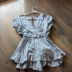 Chic blue romper with floral pattern and ruffle details. Features a tie waist for a flattering fit.