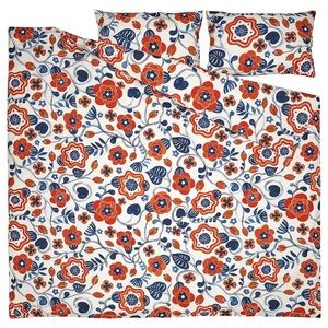 Enhance your bedroom with this vibrant floral bedding set. Featuring a stunning combination of blue and orange, this set adds a pop of color to any decor. Perfect for a cozy and stylish sleep environment.