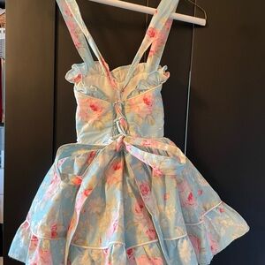 Charming kids dress featuring a delightful floral pattern. The blue and pink colors create a playful and elegant look, perfect for any occasion.