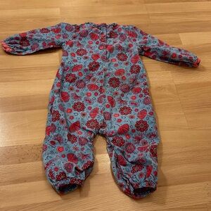 Adorable kids one piece featuring a vibrant floral design. The blue and pink colors make it a charming choice for any occasion. Velvety corduroy material. Great used condition. Paisley print with button detail at neck.