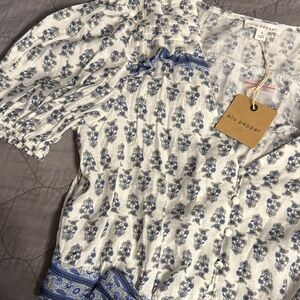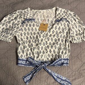 Elegant Blu Pepper blouse with floral blue patterns. Features a tie-front design and puff sleeves. Ideal for casual wear.