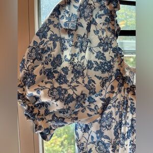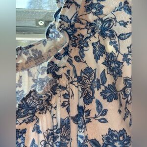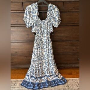 Charming floral dress in blue and white. Perfect for any occasion. Worn once and like new. Ruffled, side cutouts, ankle length. Could be work off the shoulder or sleeves on the shoulder. Size L