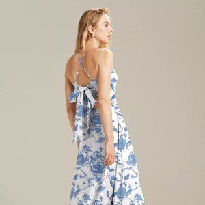The Mattie dress has a pretty V-neck bodice that is only enhanced by the bow at the back of the dress. The satin charmeuse fabric will drape across your curves in the most flattering of ways, while also giving you that elegant look you want as a bridesmaid. The spaghetti straps add a hint of flirty design while giving you the chance to show off your tanned shoulders and a beautiful necklace. Keep your accessories classic and simple, with a gold chain and simple stud earrings. The Mattie bridesmaid gown is a floor-length charmer that will look stunning with a pair of satin heels that are dyed to perfectly match the color of the dress.