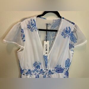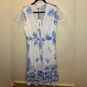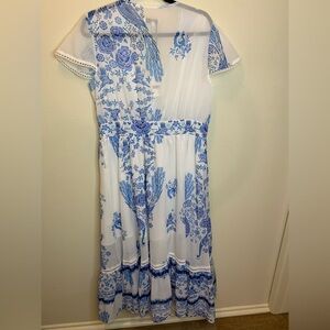 Embrace elegance with this stunning blue and white floral maxi dress. Perfect for any occasion, this dress offers a flowy silhouette and a chic design.
