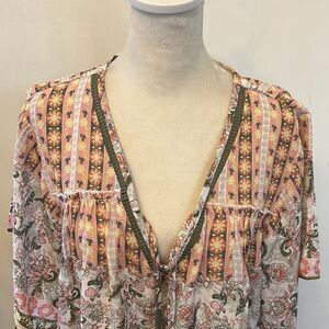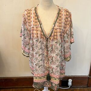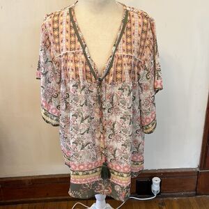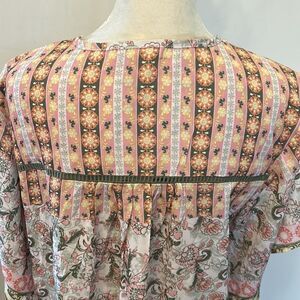 Embrace a bohemian vibe with this floral women's top. Featuring a blend of pink and green hues, this top is perfect for a casual day out.