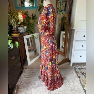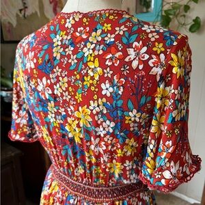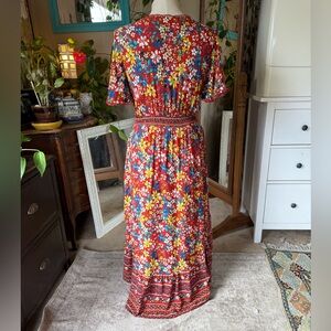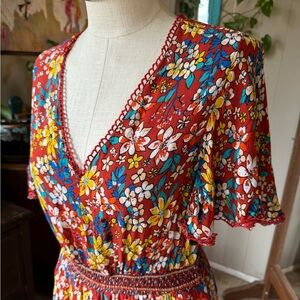 Beautiful boho flowy floral hi low dress grays V neckline, crochet trim and smocked fitted waist. Short sleeves. Lined. Garment has been hand washed and comes from a nonsmoking pet-friendly home. Some exposed red threads at V, see last photo. No holes, rips or stains.