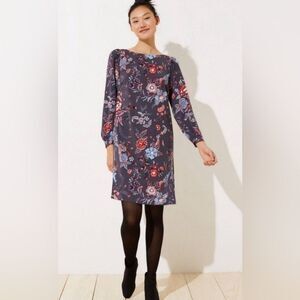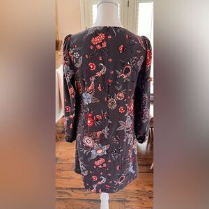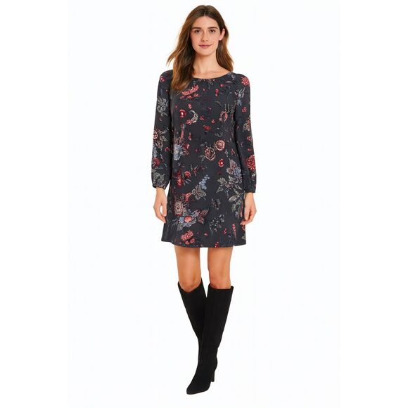 Floral boho mini shift dress in a gorgeous dark gray base with red + blue blooms, designed for effortless everyday style. Features a relaxed A-line silhouette, subtle puff sleeves, crew neckline, and a clean back-zip finish for a polished retro look. Soft drapey fabric with light stretch moves beautifully and flatters without clinging. Excellent condition with no flaws.