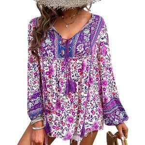 Floral Boho Top Long Sl Blouse Flowers Print Cross Deep V S-XL . Beautiful Blue Purple. With drawstring neck closure.