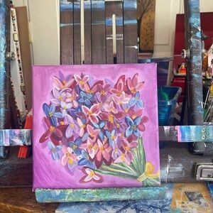 Enhance your home with this beautiful floral bouquet art painting. Featuring vibrant purple and pink hues, this piece adds a touch of elegance to any room. 8x8 wrapped canvas.