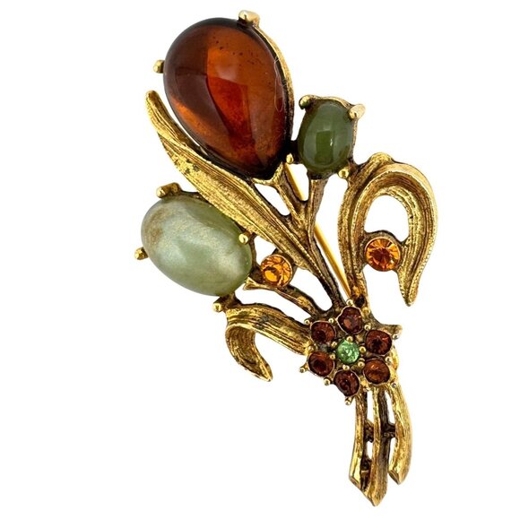 This elegant vintage brooch features a botanical design with amber and jade-colored glass cabochons, accented with topaz and peridot colored rhinestones in a gold tone setting. The piece showcases detailed metalwork with a textured finish.