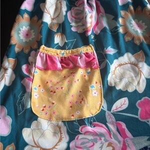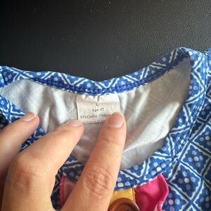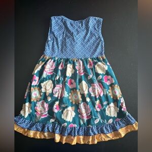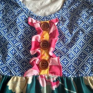 Charming kids dress featuring a vibrant floral pattern with blue and yellow accents. Perfect for any occasion.