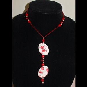 Asian inspired floral prints add a little flare to your solid color outfit! Stand out just a little bit more! Beautiful red Czech glass to add some shine and glimmer to the matted focal pieces! Simple and cute!