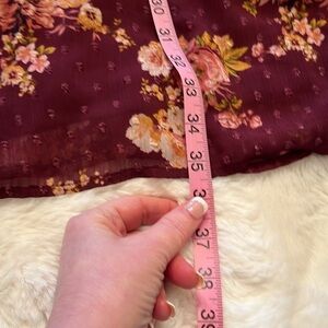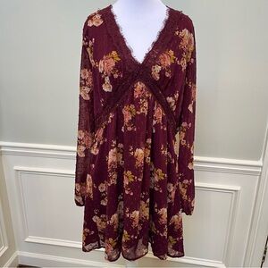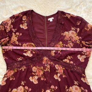 Elegant burgundy dress featuring a floral pattern and lace trim. Perfect for any occasion.