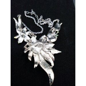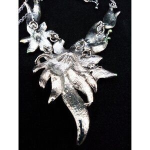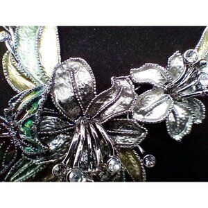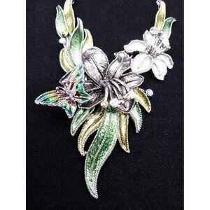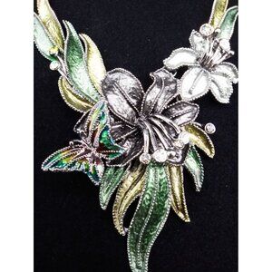 Floral & Butterfly Statement Necklace Rhinestone Accents Green Silver-Tone Metal