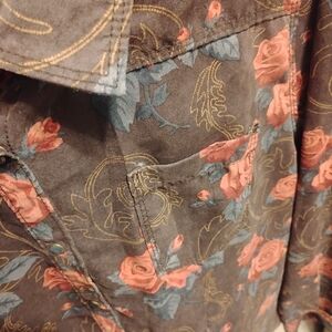 Elevate your wardrobe with this stylish floral button down shirt. Featuring a beautiful brown base adorned with vibrant orange floral patterns, this top is perfect for any occasion. Enjoy the comfort and elegance it brings to your outfit.