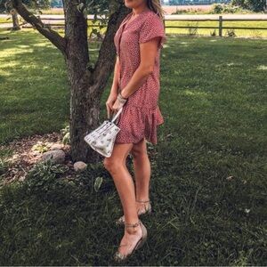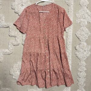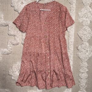 Charming red babydoll dress with a delicate floral print, short sleeves, and black button front. Features a flattering V-neckline and tiered skirt for a breezy, feminine silhouette.