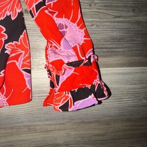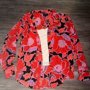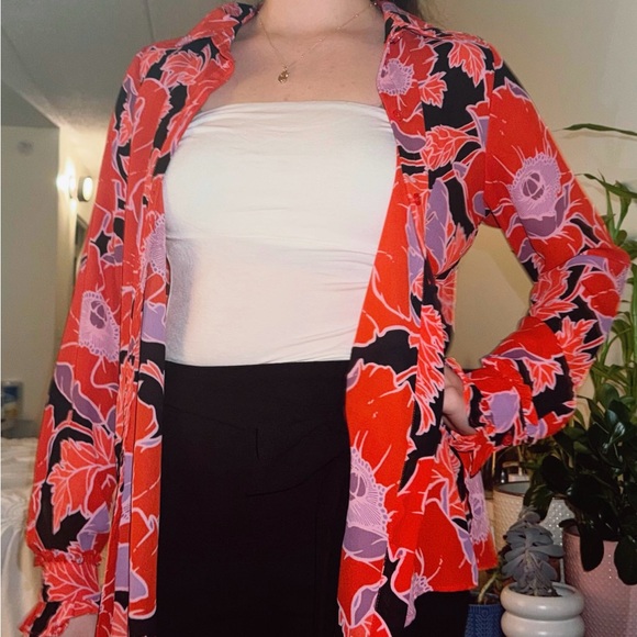Vibrant floral button-up shirt in red and black with purple accents. Perfect for a bold look and business casual ware. Size small//White shirt NOT INCLUDED, only used it as a model!