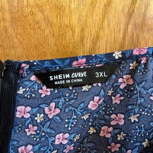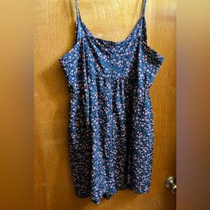 Charming floral romper with faux button-down front. Features a blue base with pink and white flowers.