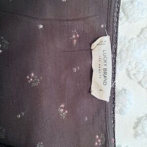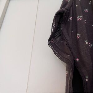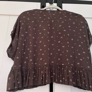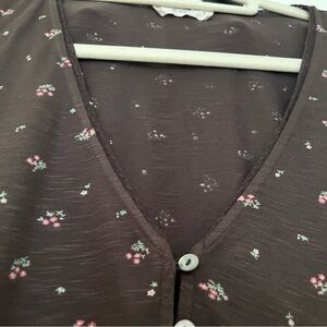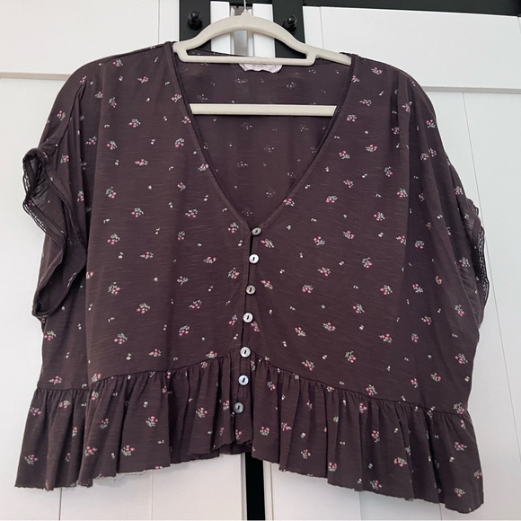 This charming floral button-down top features a deep V-neck and delicate ruffle hem. Perfect for adding a touch of elegance to your wardrobe.