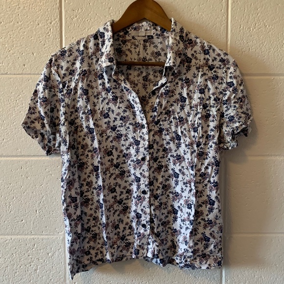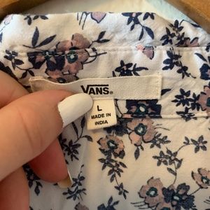 Floral printed button-down t-shirt from Vans. Print is navy and pink/purple. Size large but fits like a medium. Slight discoloration in the underarms (pictured), not very noticeable with the print. Wrinkling is from being stored in a box and will come out.