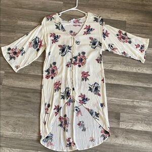 Cream tunic with floral print. Features button-down front and 3/4 sleeves. Perfect for casual wear.