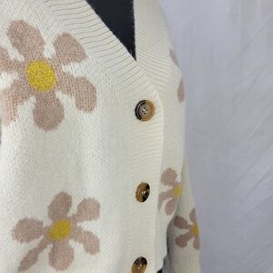 Cozy cardigan with floral design. Features button-up front. Perfect for layering.