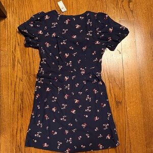 Stylish dress with floral design. Features button-up front and short sleeves.