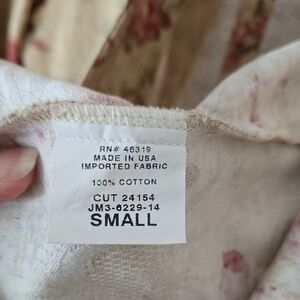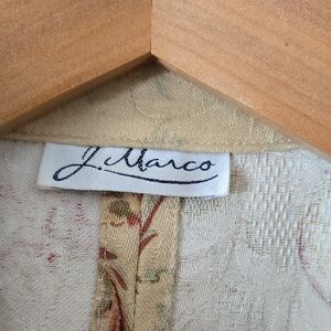 Elegant J. Marco tan floral button-up jacket with a vintage vibe. Features a beautiful rose pattern. Ruffle sleeve. Perfect for spring weather. Unlined 100% cotton. Made in USA. size small