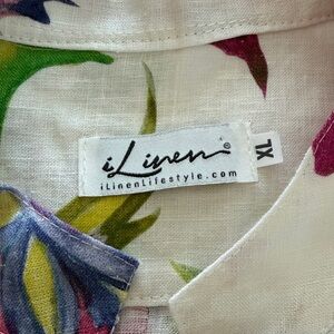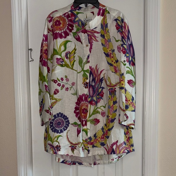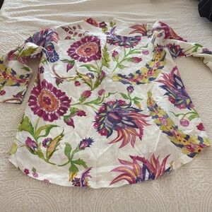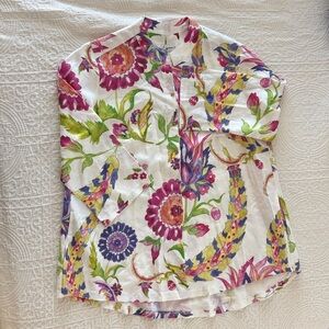 Vibrant floral button-up shirt with long sleeves.