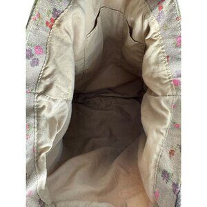 A practical floral canvas shoulder bag with sturdy brown straps, offering durability and functionality. Features multiple pockets for organized storage.