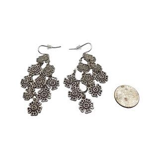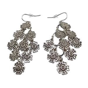 These earrings are delicate, silver-tone filigree floral dangles designed for pierced ears with French wire hooks. Each earring features multiple small, intricately detailed flowers linked together, creating a cascading effect. The flowers have an openwork design, giving them a lightweight and airy appearance. The French wire hook style makes them easy to wear and adds to their elegant and elaborate design.