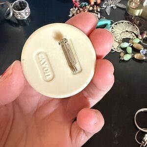 Round ceramic button with a floral design. Features pink and green colors. Vintage Avon button