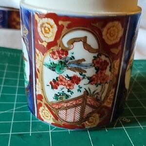 This elegant ceramic jar is listed as a cigarette /tobacco jar and features a vibrant floral design, perfect for adding a touch of color to your home decor. The blue and red hues create a striking contrast, making it a standout piece in any room.uts from the gold Imari family.no chips and painted