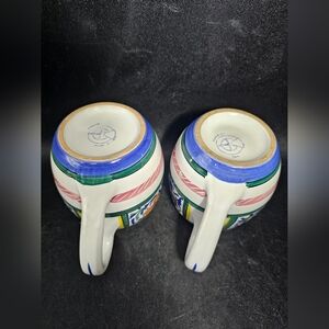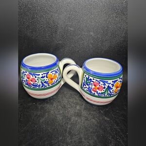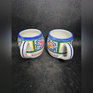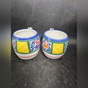 Set of ceramic mugs featuring a vibrant floral design. Accented with blue trim and colorful patterns.