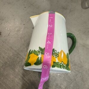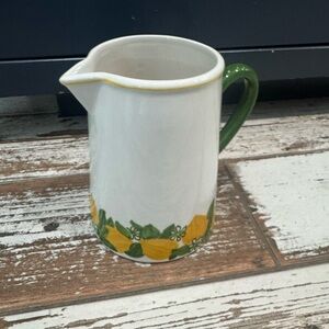 Charming ceramic pitcher featuring a vibrant green and yellow “lemon” design🍋The green handle adds a pop of color.