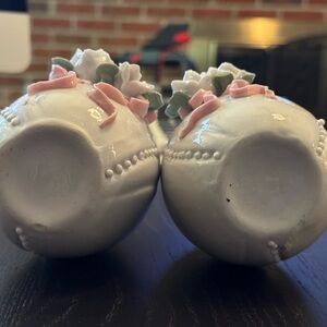 Elegant ceramic vases featuring delicate floral designs in white and pink. It could be used as a toothbrush holder. Very sweet 💐 set of 2