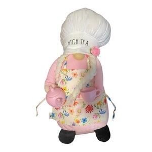 Adorable chef doll with a floral apron. Includes a pink teapot and cup. Ideal for kitchen decor.