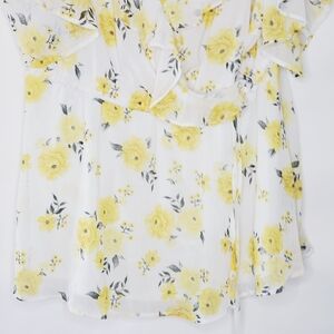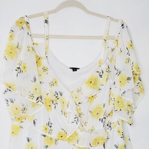 Torrid Yellow Floral Chiffon Blouse Size 2X. A figure flattering stretch waist airy pretty top with shoulder baring cutouts and ruffle trim. Colorway - "Break Time Blooms".