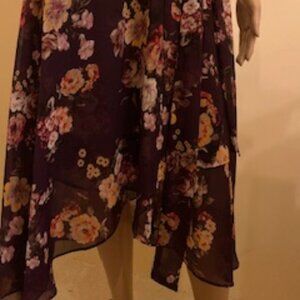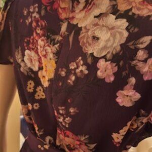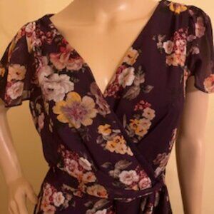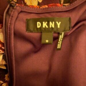 DKNY Floral dress. Burgundy with white, pink, red and yellow flowers. Criss-cross v-neck with cap sleeves. Lined. Back zipper. Matching fabric waist tie.