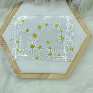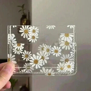 Clear vinyl material with floral design. There are few stock of these. The floral design placement is not the same on each one. Each cut is different due to this card wallet material made from floral design vinyl
