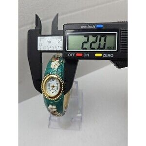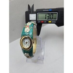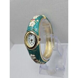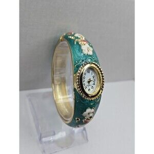 Floral Cloisonne Style Hinged Bangle Watch Green Enamel Gold Tone New Battery