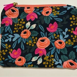 Brand new with tags Paperty 7"x9" Zipper Accessories Pouch or Cosmetics Makeup Bag. Floral design in hues of Navy and Coral. Handmade in Michigan. Tag reads "pink lemonade" and priced at $22.95