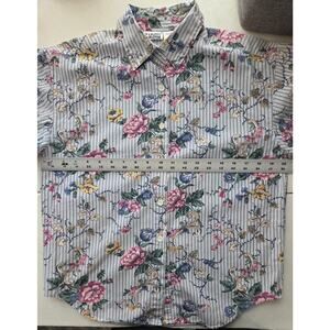 This beautiful vintage button-down shirt is a unique and charming find! Featuring a delightful floral print with classic blue and white stripes, it brings a touch of cottagecore to any outfit. The button closure adds to its timeless appeal. It's in petite medium size, perfect for a comfortable and flattering fit. Check out the photos for measurements to ensure it's just right for you! Thank you for shopping my closet – I hope you love this shirt as much as I do!