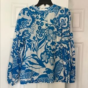 !00% cotton blouse from Boden. Tinny ruffle detail around neck. Simple front placket. Gathered sleeves with elastic cuff. Great condition - worn few times. Machine washable. No stains, rips or tears. Non-smoking, pet friendly home.