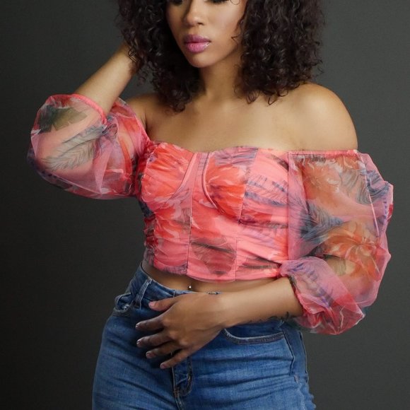 Pink Floral Crop Top w/ Quarter length sleeves. This top is also available in a Yellow Floral pattern. The model is wearing a size small.