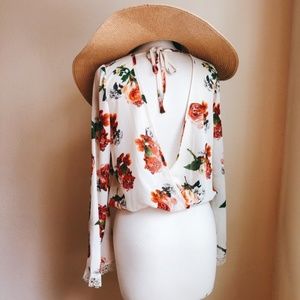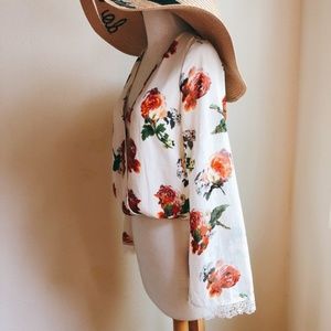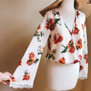 This super cute flower print top from Tobi will make you ready for any instagram picture anywhere~! The front and back has surplice wrap design the bottom holds with elastic all around. There is a tie on the back to prevent clothes from slipping off your shoulders. The slight bell sleeve with lace trim detail adds the extra femininity to this top!