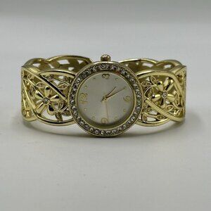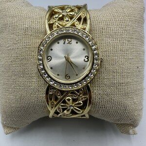 Floral Cuff Band Watch Gold Tone Women Rhinestone Bezel New Battery 6.5 Inch