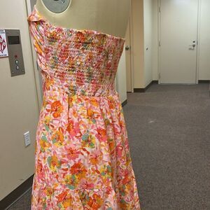 Vibrant strapless dress with a floral pattern. Features a stylish cutout design. Perfect for summer outings.