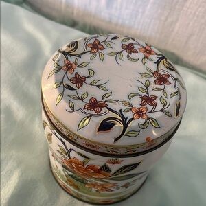 Beautiful floral decorative tin with vibrant colors. Perfect for storage or display.