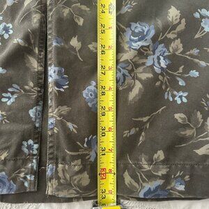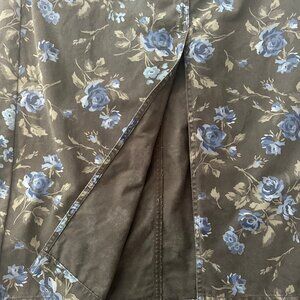 Floral straight midi skirt in 100% cotton denim from Eddie Bauer. Olive background with blue and tan flowers. Button up front with front slit. Size 12P